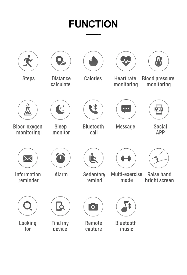 Freqüência cardíaca, monitoramento do sono, chamada bluetooth, lembrete sms, lembrete de entrada, modo multi-esporte, passos, distância, calorias, música bluetooth, captura remota, encontrar o meu dispositivo, cronômetro